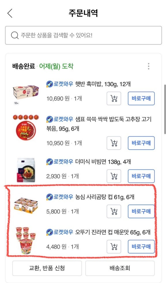 쿠팡으로 컵라면, 소고기고추장, 장조림, 고추참치, 햇반을 잔뜩 주문했다.